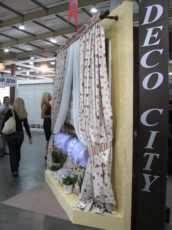 «DecoCity» - российская компания, открывшая филиал в Украине. Большой стенд. От количества образцов голова идёт кругом. Направление деятельности – продажа всего ассортимента товаров эконом-класса для солнцезащиты и оконного декора: карнизы, аксессуары, фурнитура и ткани для штор, тканевые ролеты собственного производства и многое другое…