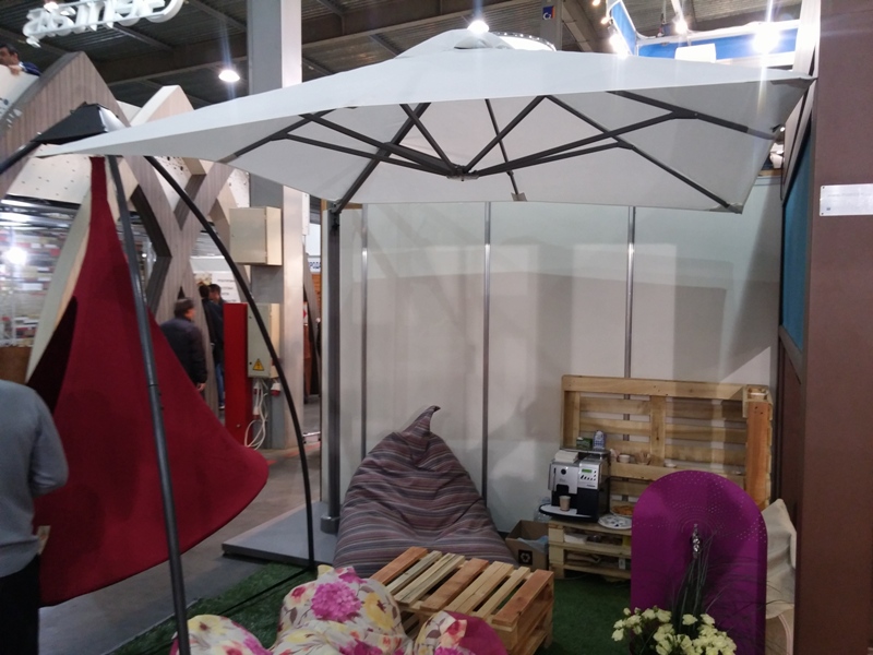 Далее был стенд компании «Евро Ворота», довольно плотно занимающейся наружной солнцезащитой. Здесь можно было увидеть рафштору, террасную систему, локтевую маркизу и систему "Парус", расположеную над стендом. Также компания продает зонты от солнца Scolaro, поставляющиеся под заказ в течение 4-х недель.