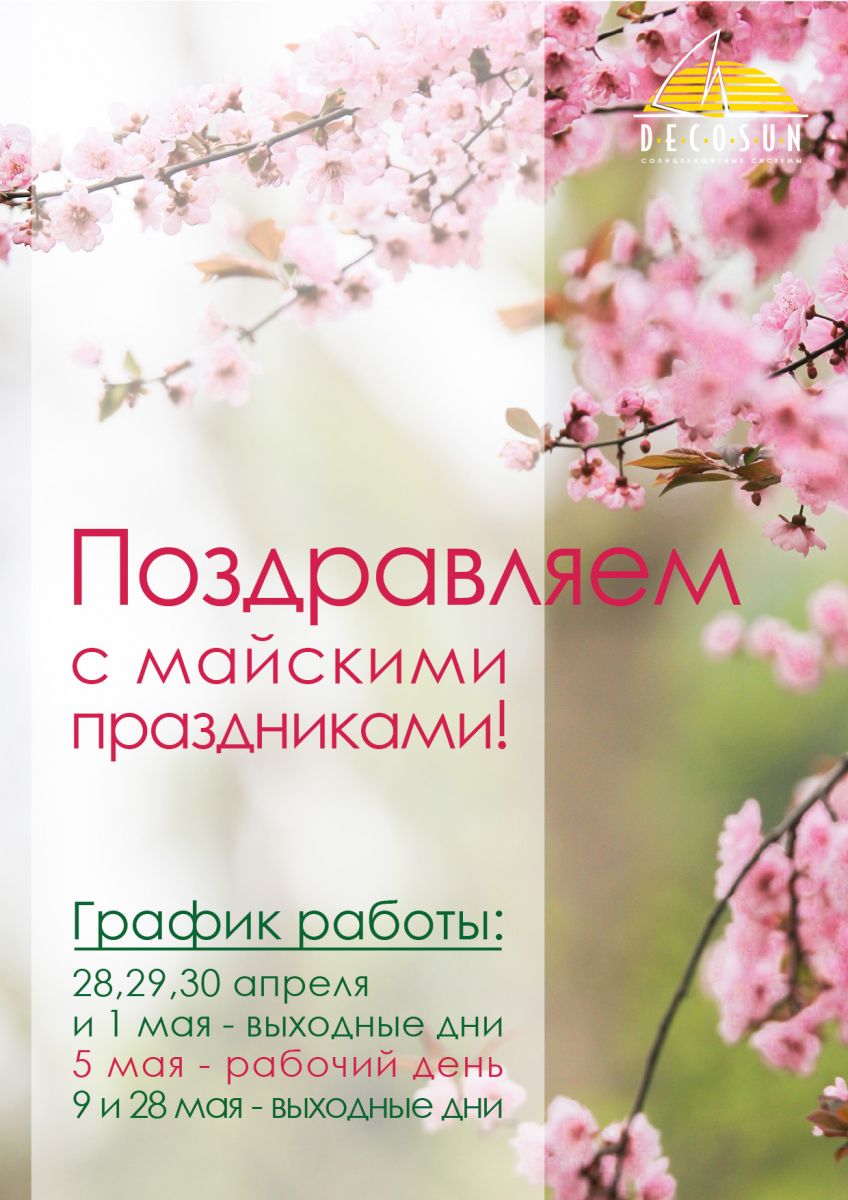 Графік роботи компанії Роліс: 28.04. - 01.05. - вихідні дні 05.05. (субота) - робочий день 09.05. (середа) - робочий день 26-28.05. (Трійці) - вихідні дні |