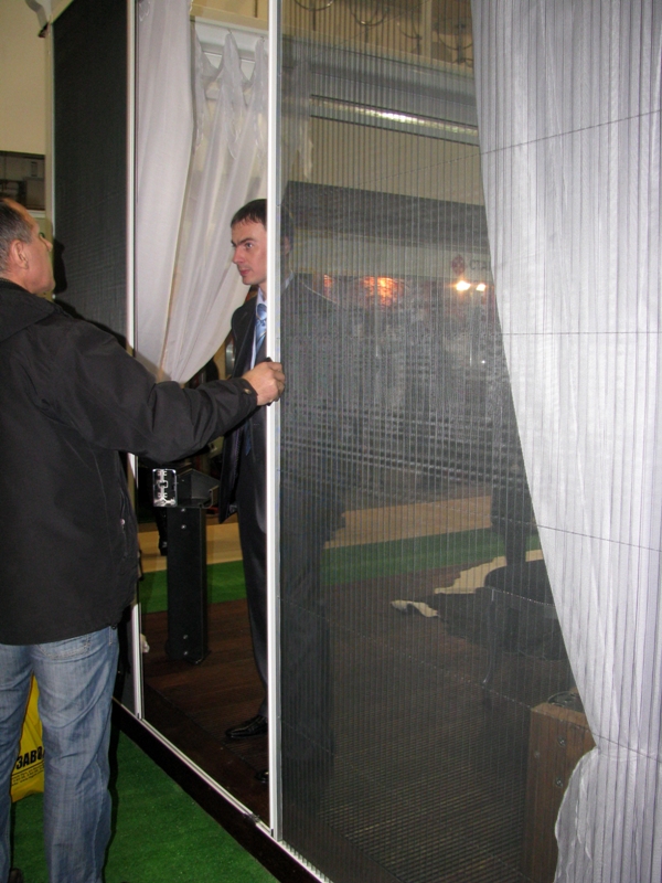 Наряду с этим, были представлены и более традиционные виды жалюзи. Большой интерес у посетителей вызвала представленная здесь же противомоскитная сетка-плиссе. Эта легкая и компактная система позволяет закрывать довольно большие проемы, а профили и ткань сетки могут предлагаться в нескольких цветовых решениях.