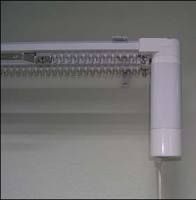 На фотографиях можно рассмотреть типовую модель раздвижного электрокарниза, которая включает в себя электропривод (двигатель с устройствами управления и защиты – на снимках он справа), несущий алюминиевый профиль, в котором движется прочный зубчатый резиновый ремень, усиленный металлической нитью, к которому прикреплены мастер-глайдеры (на фотографиях – в виде слегка изогнутой металлической полосы).